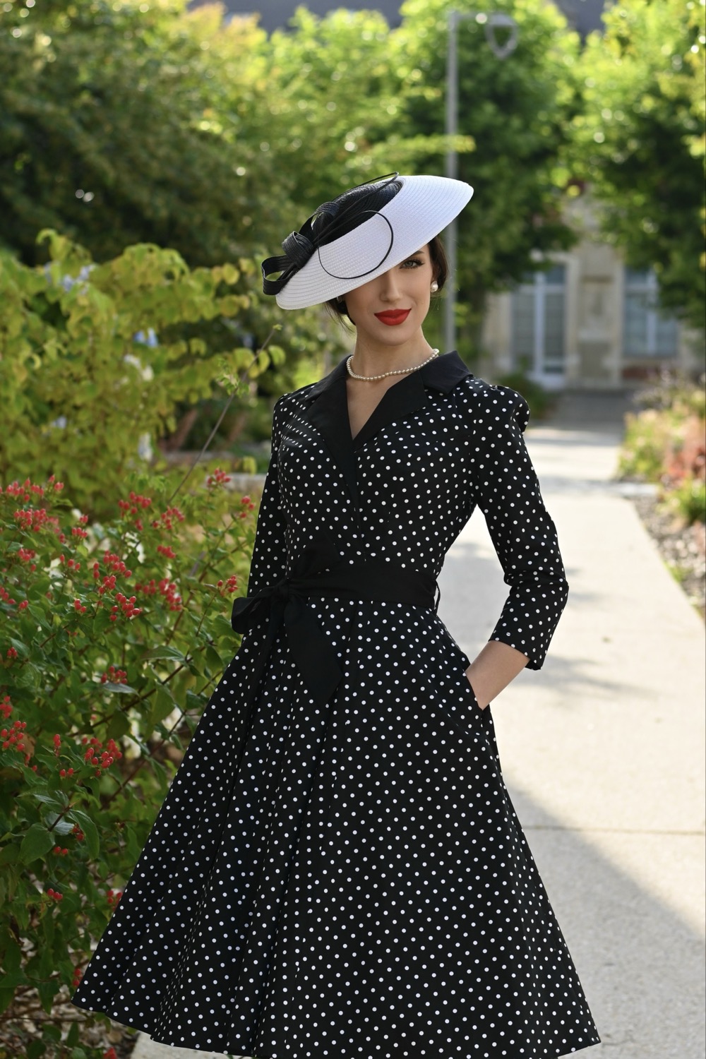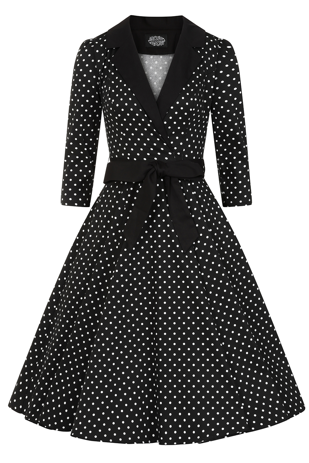 Machen Sie eine Zeitreise mit unserem bezaubernden, schwarz-weißen Cora Polka Dot Swing-Kleid im 50er-Jahre-Stil – perfekt, um Vintage-Eleganz mit einem verspielten Touch zu vereinen. Mit einem klassischen Reverskragen und einer schmeichelnden Wickelfront betont das Kleid die Silhouette auf wunderbare Weise mit seinem taillierten Bund und dem Bindegürtel, der durch dezente Gürtelschlaufen perfekt an Ort und Stelle gehalten wird. Die gerafften 3/4-Ärmel sorgen für einen Hauch von Weichheit, während der verdeckte seitliche Reißverschluss für eine glatte, nahtlose Passform sorgt. Das Kleid wurde sowohl für Stil als auch für Funktionalität entworfen und verfügt außerdem über diskrete Seitennahttaschen. Dieses Kleid ist ideal für tagsüber oder abends und kombiniert zeitloses Flair mit modernem Komfort.